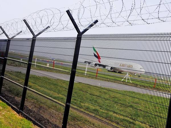 Safe welded-mesh perimeter for airfields; V-bend/roll-top panels with low-glare finish and clear sight lines.